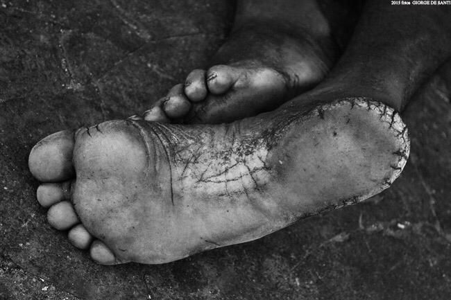 Através desses pés, com profundas feridas, calejados, disformes, marcados pelos caminhos, pela vida.